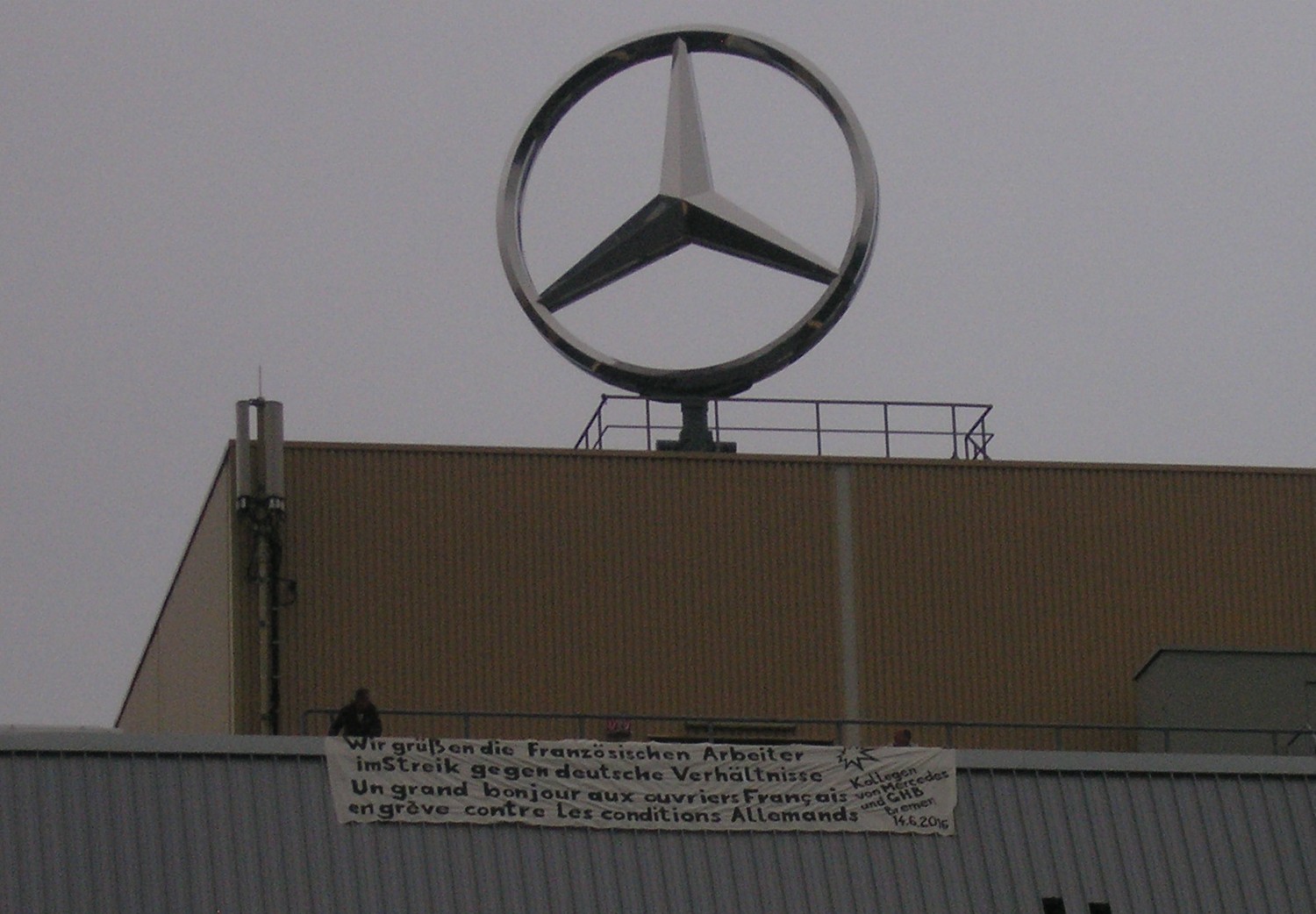 WeiterlesenBremen, 14. Juni 2016, früh morgens: Vom Dach der Halle 7 des Bremer Mercedes-Werkes hängt ein Großtransparent mit folgendem Gruß…