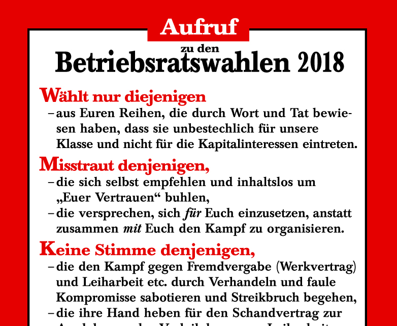 WeiterlesenWir veröffentlichen hier einen Aufruf zu den Betriebsratswahlen 2018. Der Aufruf kann auch als Aufkleber, zweifarbig in der Größe 10…
