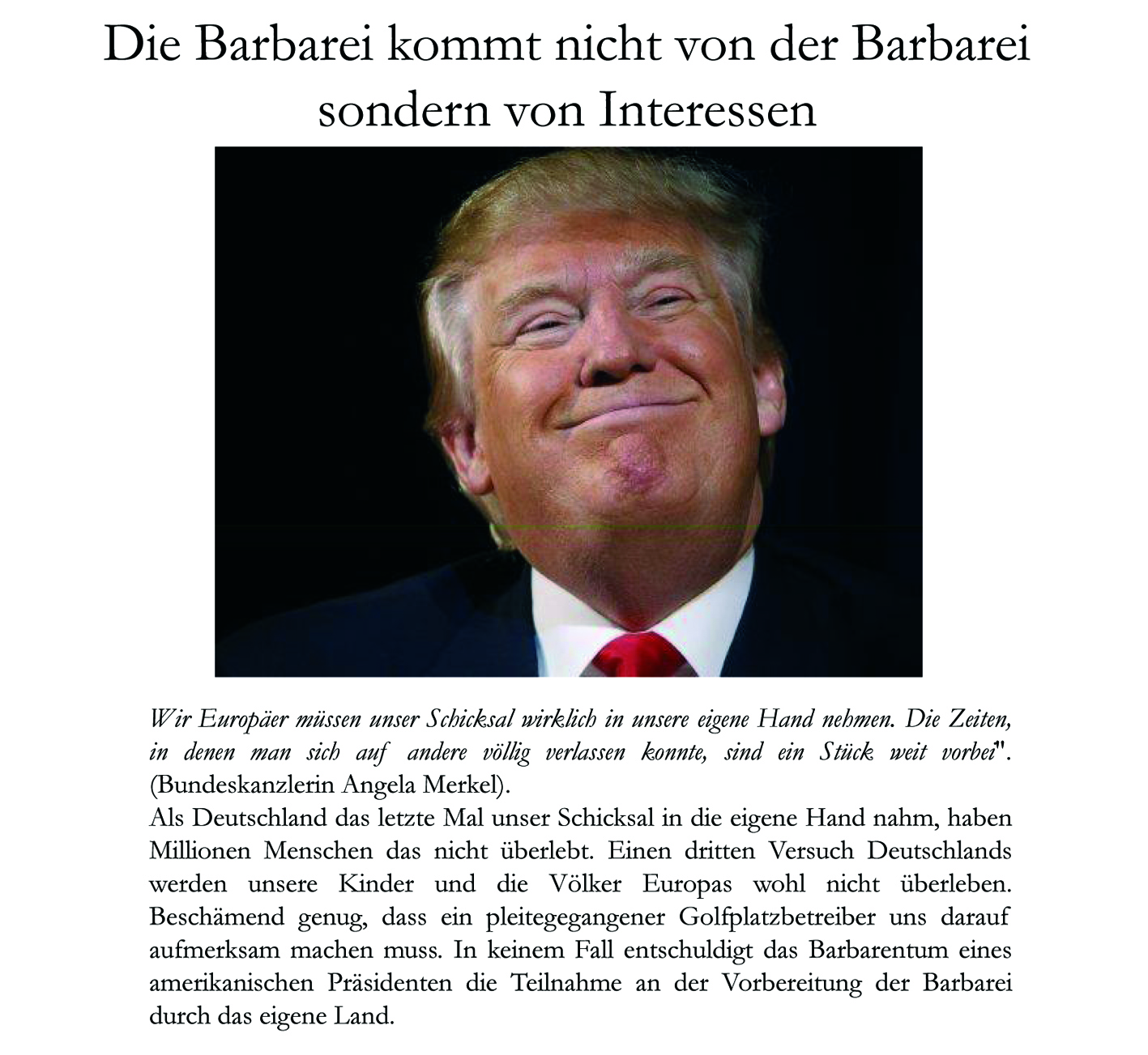 WeiterlesenIn keinem Fall entschuldigt das Barbarentum eines amerikanischen Präsidenten die Teilnahme an der Vorbereitung der Barabarei durch das eigenen Land.
