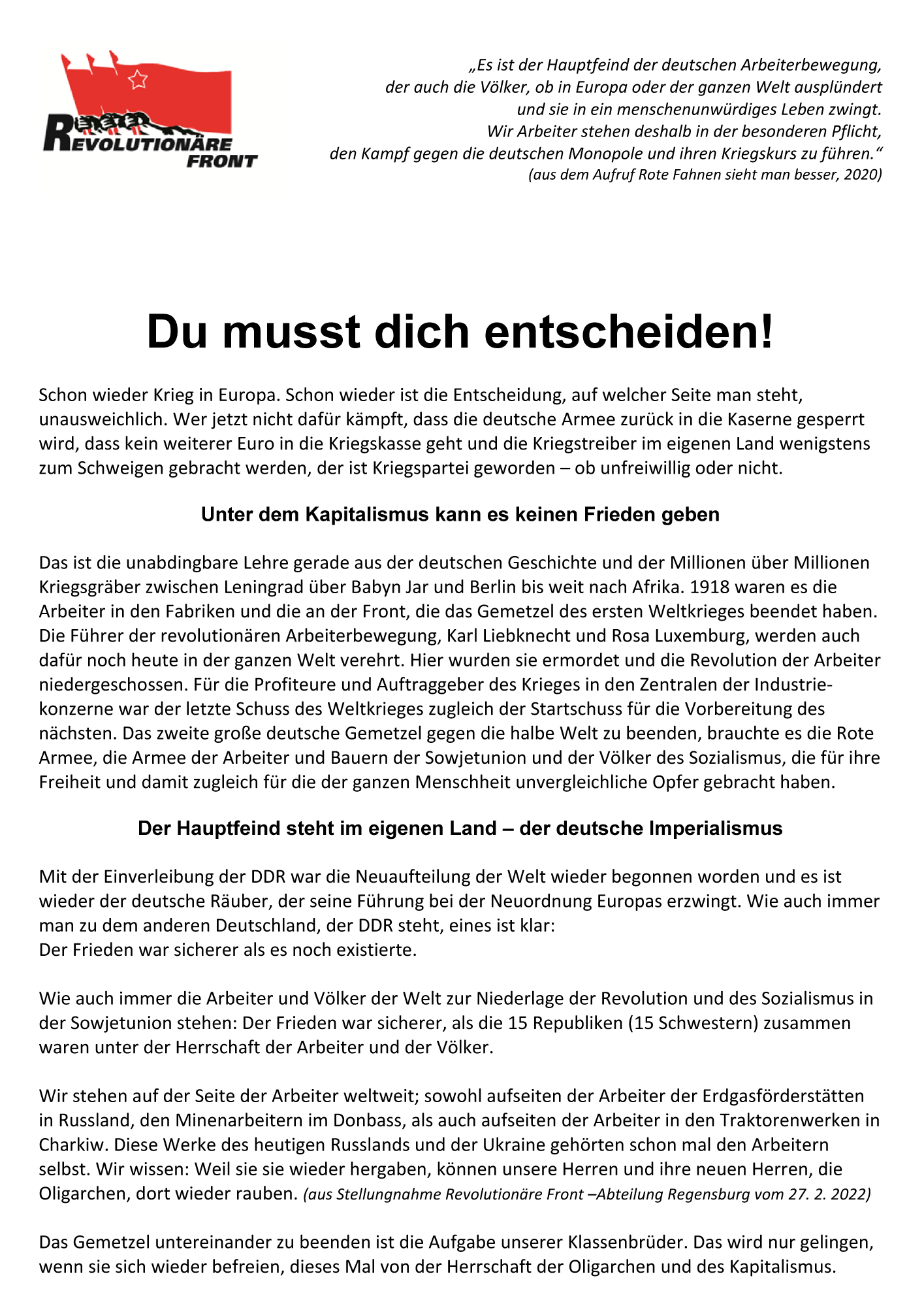 Erklärungen Du musst dich entscheiden! Rainer Herth März 13, 2022 0 Stellungnahme Zentraler Rat AntimilitarismusDeutscher KriegKriegsvorbereitungNotstand der Republik