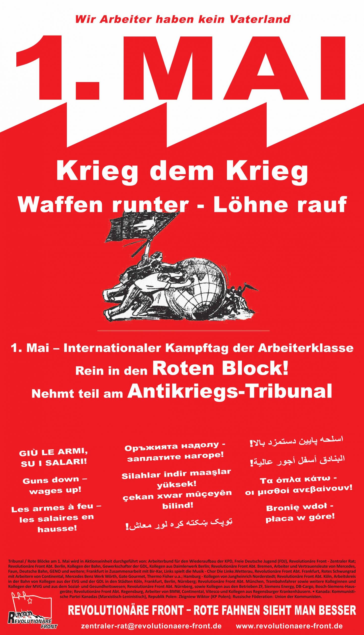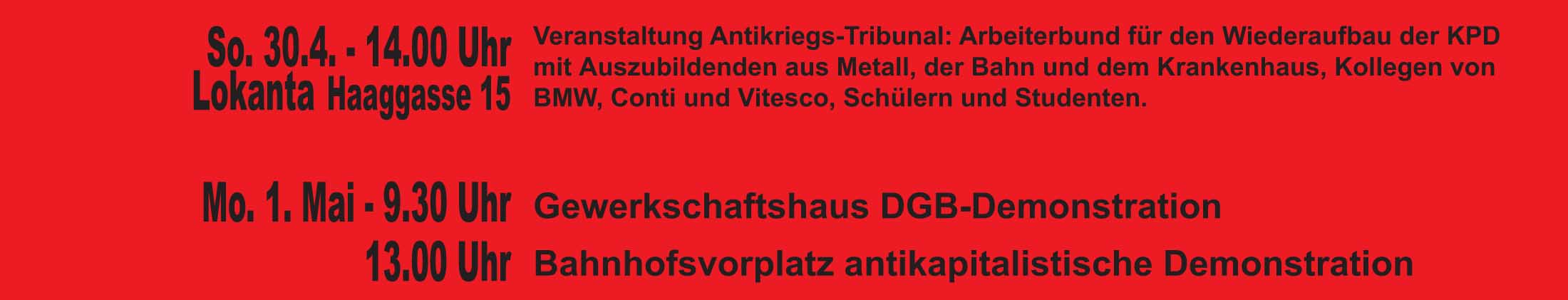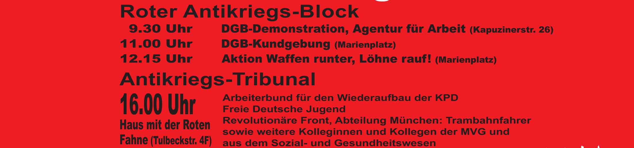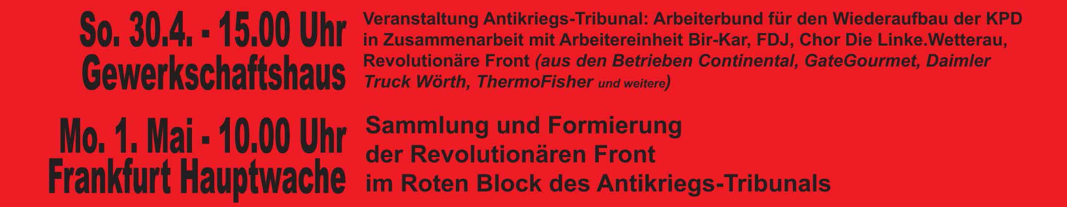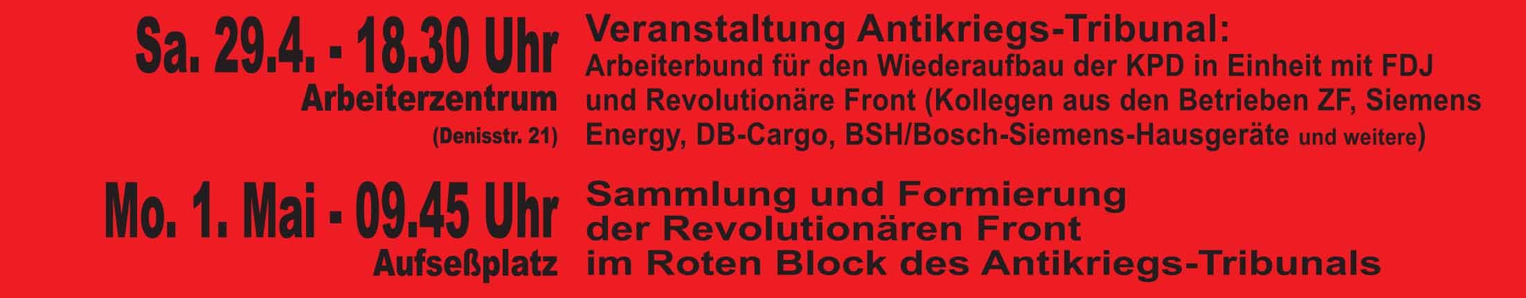 Der Zentrale Rat – Revolutionäre Front hat die Aktionseinheit im Antikriegs-Tribunal mit dem Arbeiterbund für den Wiederaufbau der KPD zum Internationalen Kampftag der Arbeiterklasse im Kriegs-Jahr 2023 beschlossen.