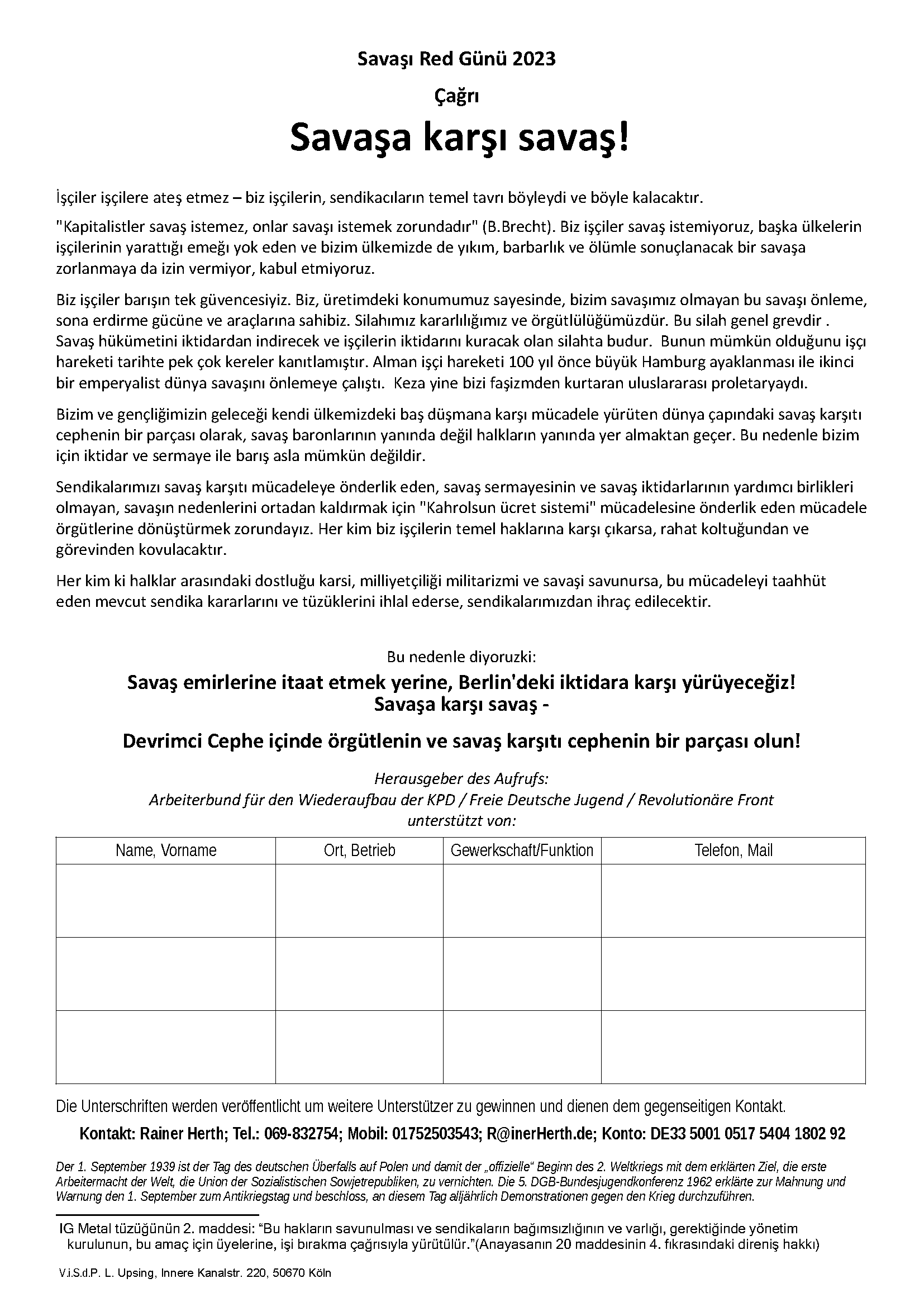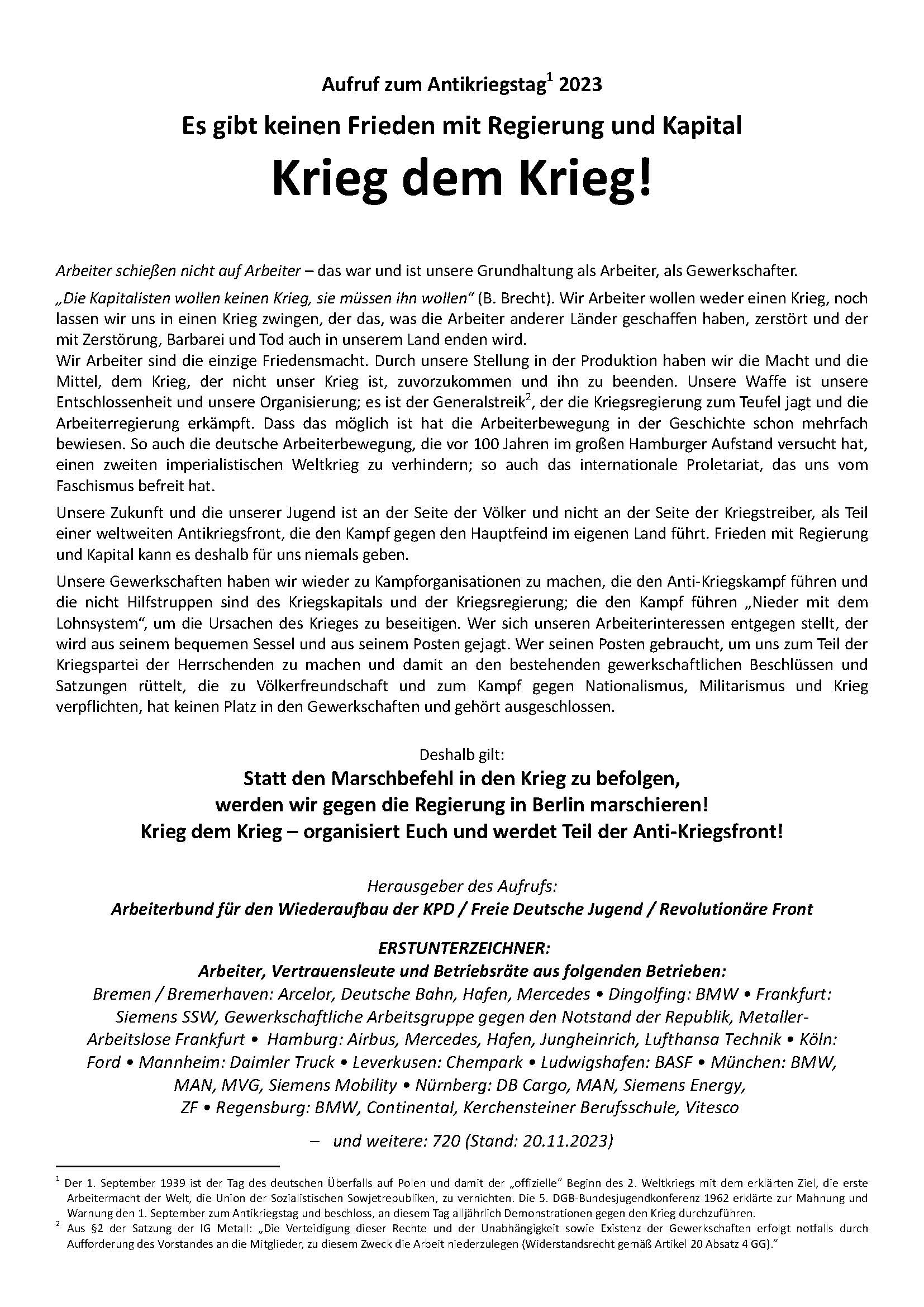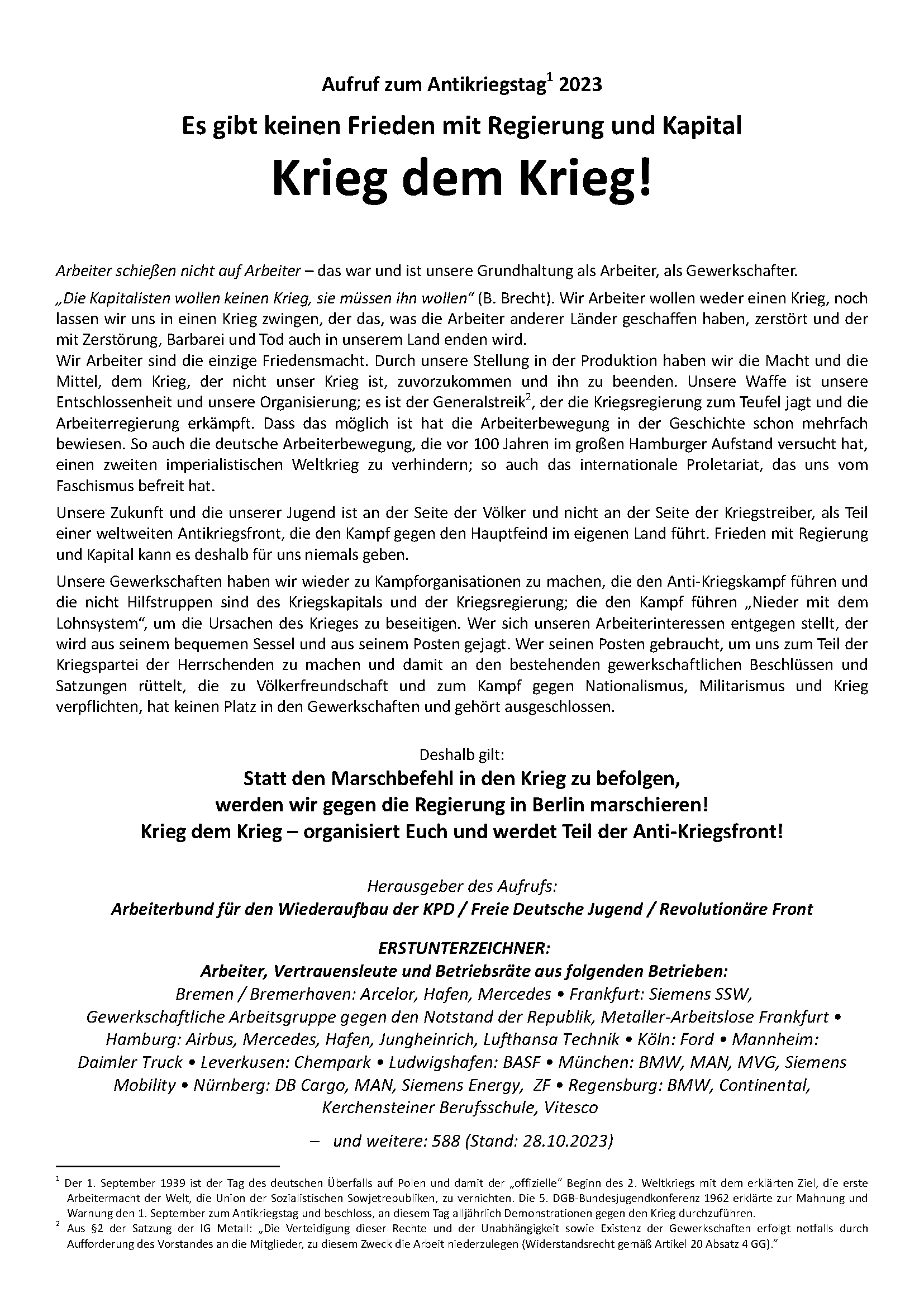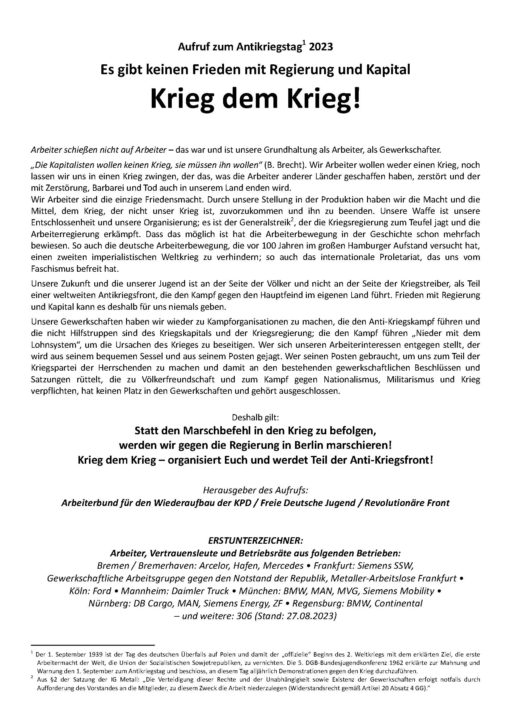 Die Revolutionäre Front – Rote Fahnen sieht man besser hat beschlossen in einer Einheit mit dem Arbeiterbund für den Wiederaufbau der KPD, der FDJ und der Revolutionären Front gemeinsam diese Unterschriftenkampagne zu starten und damit vor und in die Betriebe zu gehen. Unterschreibt/Unterstützt den Aufruf damit wir die Kriegsgegner zusammen schließen können, auch im Handeln. Die Unterschriften sollen vor dem 1. September, dem Antikriegstag, „zurück gehen“ in die Betriebe um weitere Unterstützer zu finden und um beim Antikriegstag und den Aktionen an diesem Tag veröffentlicht zu werden, kurz um dazu beizutragen die nationale und internationale Anti-Kriegsfront zu schmieden. Aber auch über den Antikriegstag hinaus kann dieser Aufruf als Grundlage dienen für den kommenden Gewerkschaftstag der IG Metall, um dem Vorstoß, ausgehend vom Vorstand der IG Metall „uns zum Teil der Kriegspartei zu machen“, die Haltung der internationalen Arbeiterklasse entgegen zu setzen: Krieg ihrem Krieg!