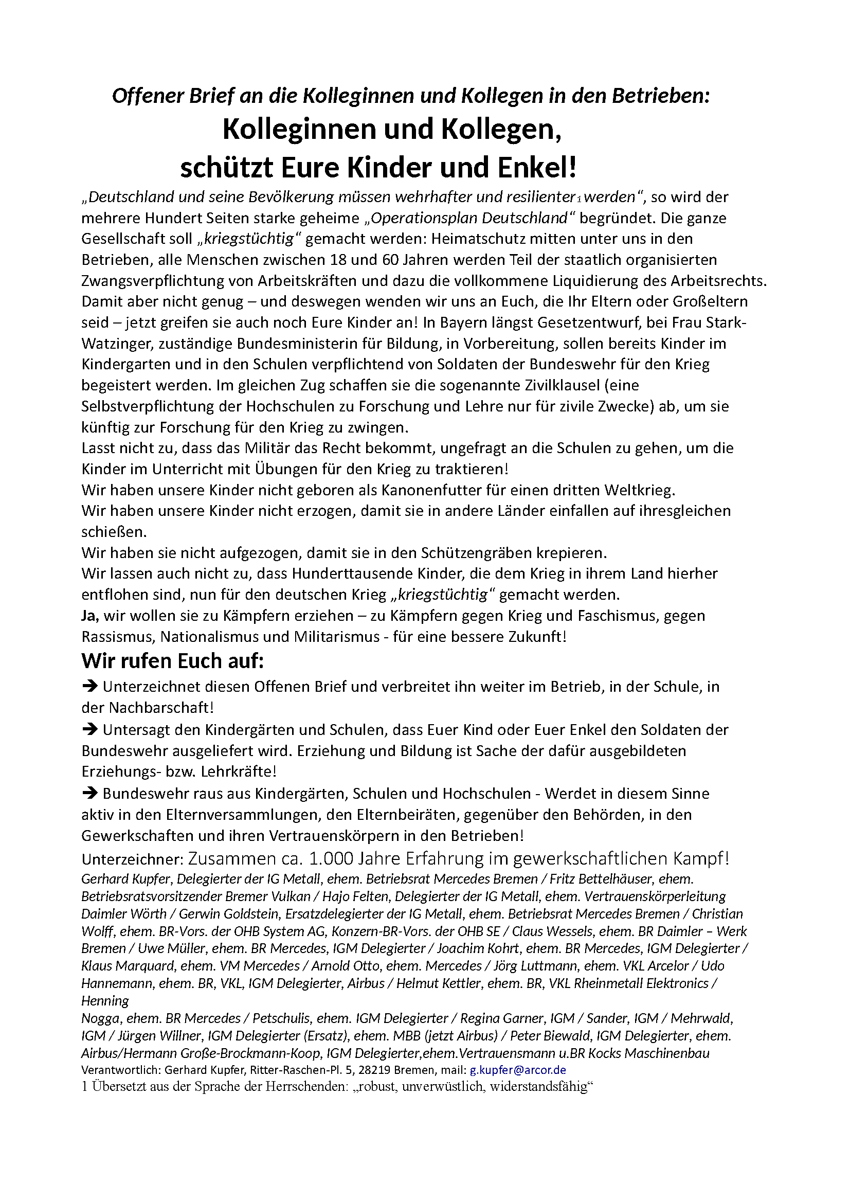 Kriege brechen nicht aus, Kriege werden gemacht und also vorbereitet. Über Aufrüstung, Wehrpflicht, Kriegswirtschaft und die Kriegsertüchtigung dringt der Krieg und seine Vorbereitung in jeden Winkel der Gesellschaft.