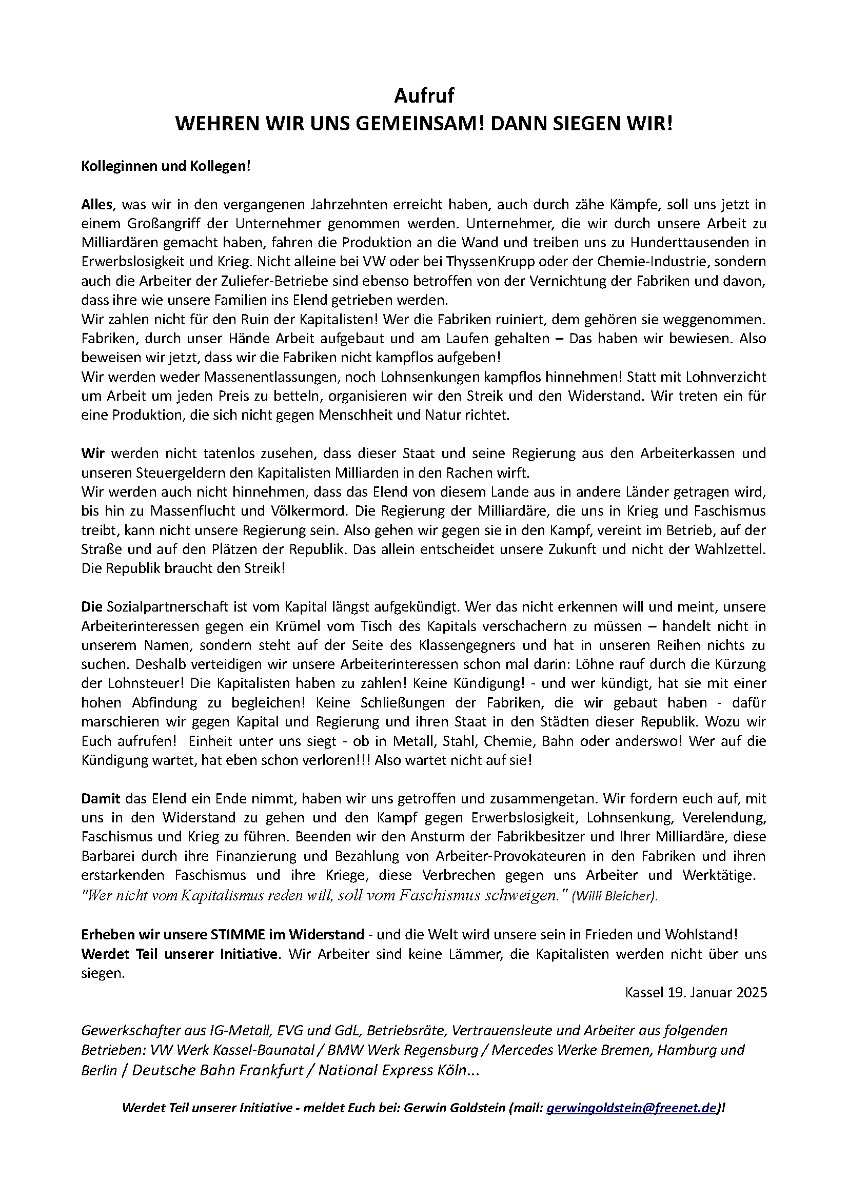 Aktionseinheit Wir dokumentieren den Aufruf: WEHREN WIR UNS GEMEINSAM! DANN SIEGEN WIR! Rainer Herth Jan. 23, 2025 0 Aufruf als pdf