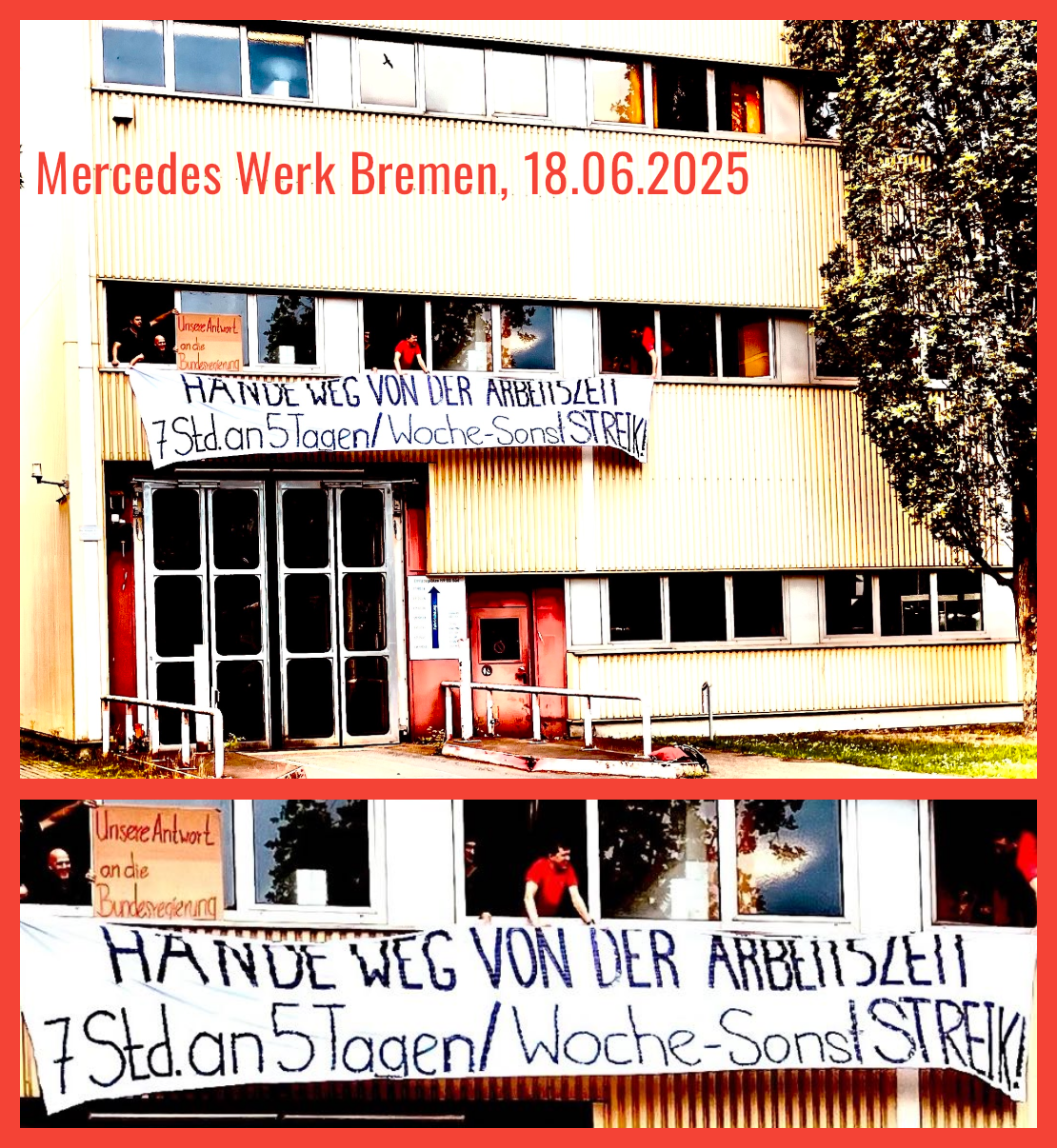 „Am 18.6.25 wurden Kolleginnen und Kollegen im Mercedes Werk Bremen aktiv und hingen ein 12 Meter Transparent aus dem Fenster der Halle 9. Auf dem Transparent stand in Großer Schrift „UNSERE ANTWORT AN DIE BUNDESREGIERUNG: HÄNDE WEG VON DER ARBEITSZEIT. 7 STUNDEN AN 5 TAGEN/WOCHE – SONST STREIK“. Warum diese Aktion? Der Koalitionsvertrag beinhaltet eine Reihe gravierender Angriffe auf Arbeitnehmerrechte. Der bedeutendste ist die Aufhebung des Normalarbeitstages und damit verbunden des Arbeitszeitgesetzes. (…) Mehrere Bremer IG Metall Delegierte fordern deshalb mit einem Antrag auf der Delegiertenversammlung am 30.6 den IG Metall Vorstand auf, zumindest den gesetzlichen 8-Stundentag, das Arbeitszeitgesetz in der jetzigen Form, ohne Abstriche mit allen Mitteln zu verteidigen und dafür auch alle notwendigen Vorbereitungen für eine Arbeitsniederlegung zu treffen…“