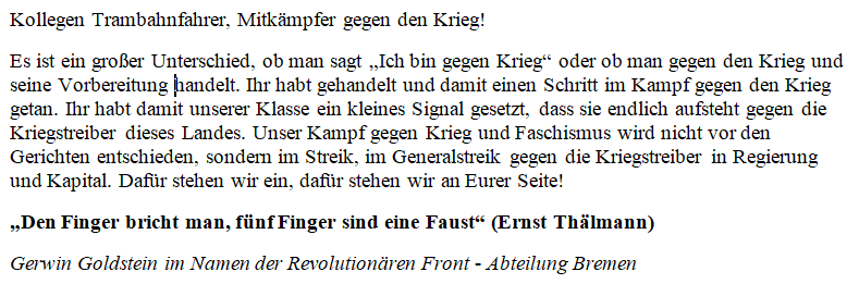 Die Revolutionäre Front – Abteilung Bremen hat zum Prozessauftakt eine Solidaritätserklärung an die Kriegsgegner verfasst
